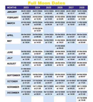 Below is a list of Full Moon dates. Use this list and the Moon phases chart above to set your moon to look like the Moon outside. The time given for each Full Moon is UTC or Coordinated Universal Time. This is only fractions of a second different to Greenwich Mean Time. Adjust the time of each Full Moon to match your time zone.