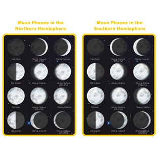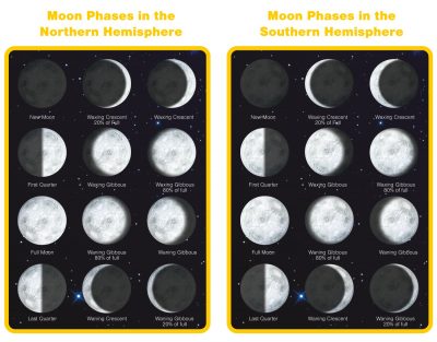The Moon orbits the Earth near to the Equator, so people in different hemispheres see the moon from a different vantage point. People in the Northern Hemisphere are standing on the opposite side of the globe to the people in the Southern Hemisphere, so in effect we are upside down to each other! So, a person from one hemisphere will think the Moon looks upside down if they go to the other hemisphere. Likewise, the way we view the Moon phases is different in each hemisphere, as shown on the charts above.
