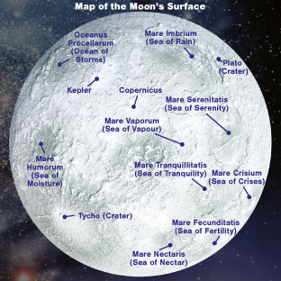The dark patches are plains formed by lava flows very early in the history of the Moon. They are called mare or plural maria, which is Latin for sea, because early astronomers thought these dark areas were filled with water.
