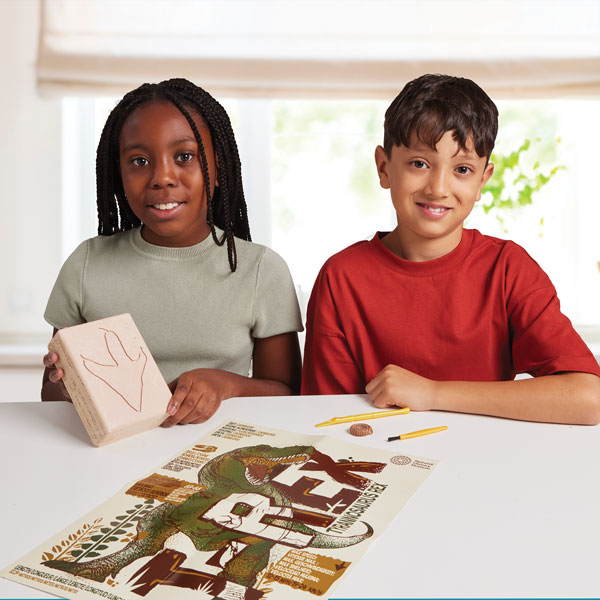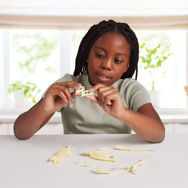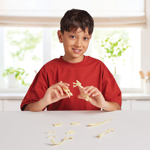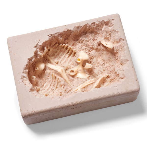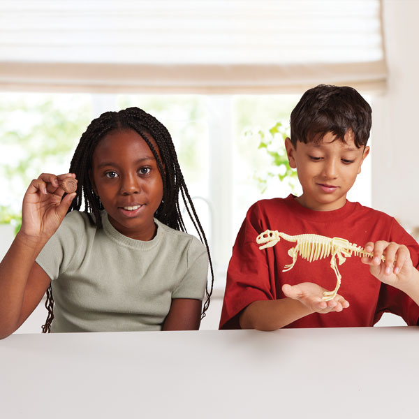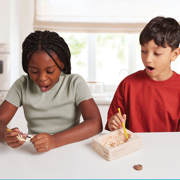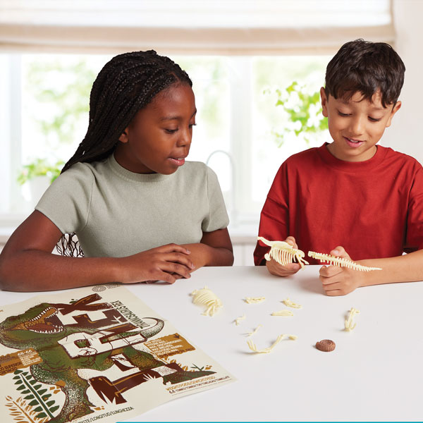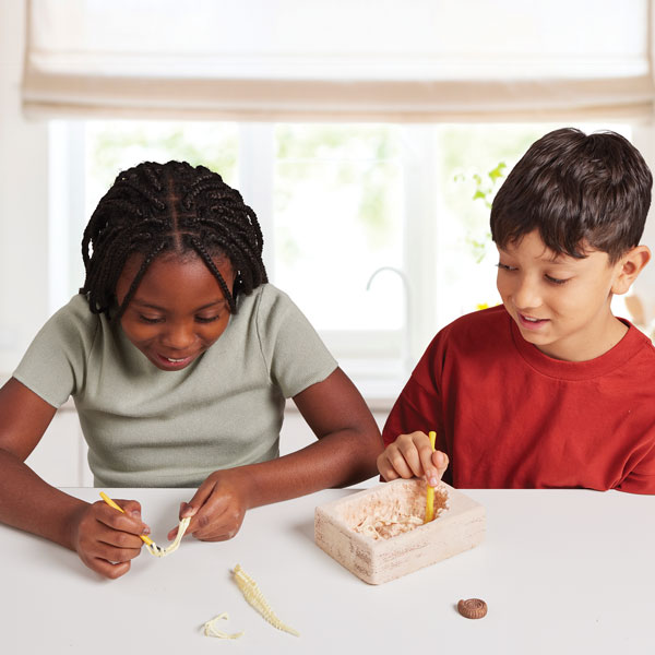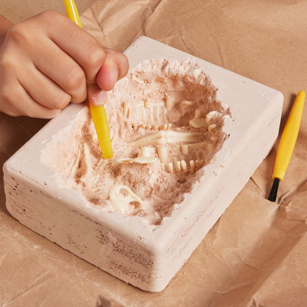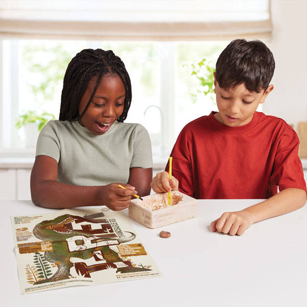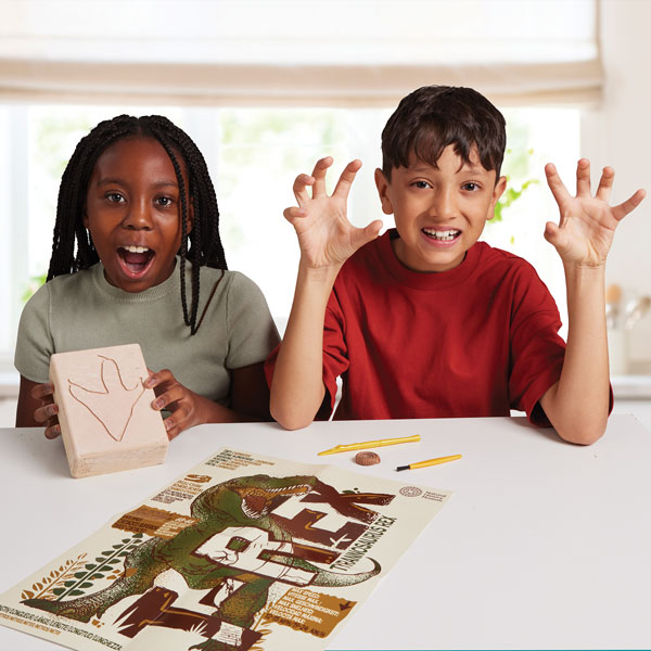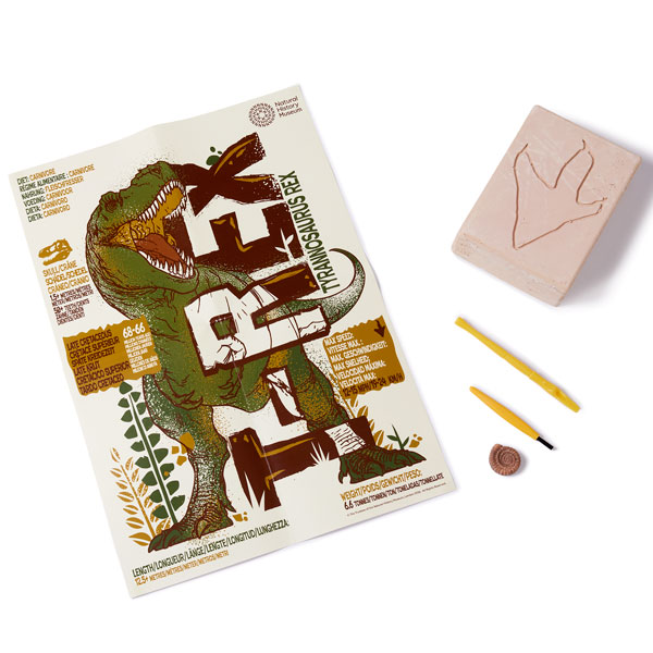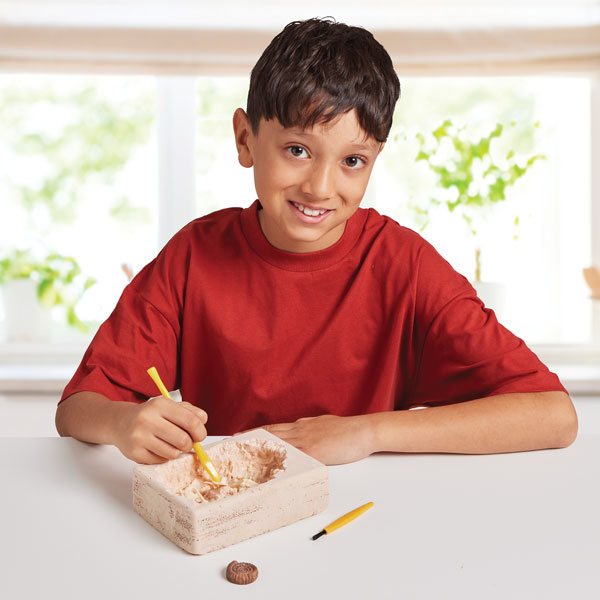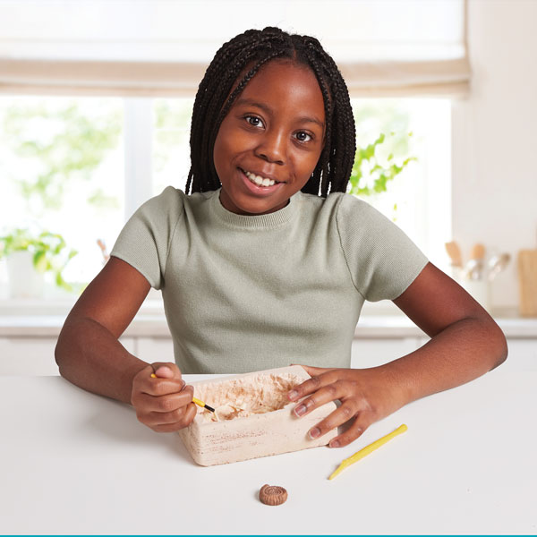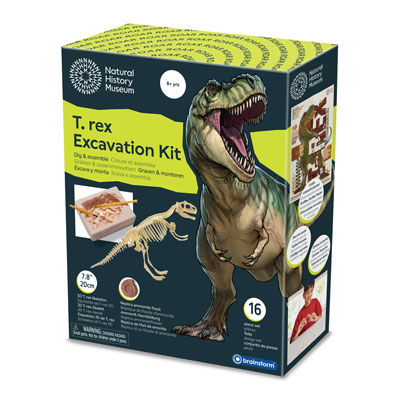 Great for a young paleontologist! This hands-on excavation kit includes everything you need to chip, brush, and reveal a realistic T. rex skeleton hidden inside. Assemble the bones to create a 7.8“/20cm model dinosaur. This kit even includes a replica ammonite fossil too! Easy-to-follow instructions and online tutorial. Secret code unlocks fun online T. rex facts.